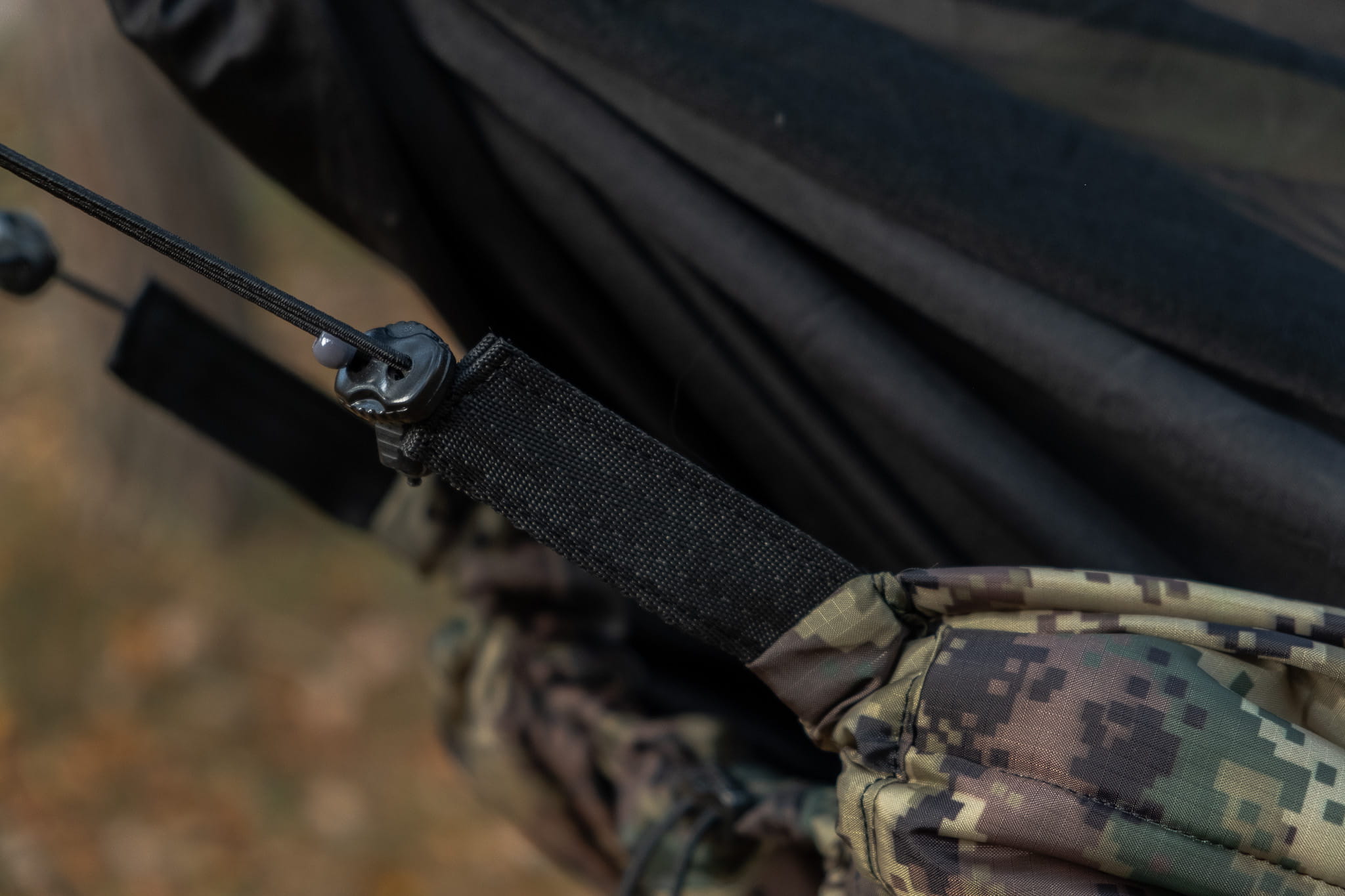 System ściągaczy ze stoperami pozwala na łatwe i szybkie zamocowanie podpinki do każdego hamaka.